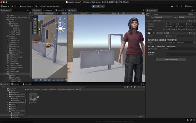 - Added a door. Animation disappeared during import, so manually added an animation segment. GPT-written script had incorrect rotation direction (rotating around the Y-axis made it look like a Ferris wheel). Modified to rotate 180 degrees around the Z-axis.