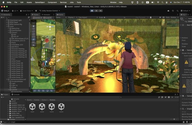 - Added flower blooming animation (cannot directly link entry to bloom animation, as it triggers auto-play). Instead: `entry > new state bloom` on one side without linking anything