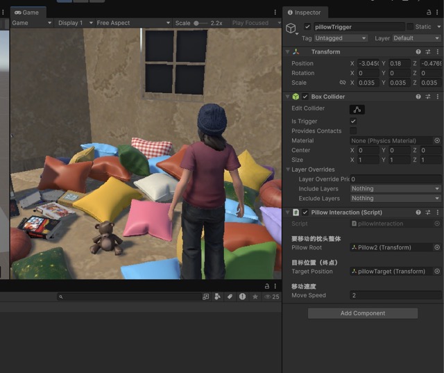 - Later improved by splitting the pillows into two groups: left and right. Asked GPT to write an interaction script. In the pillow trigger, selected pillowRoot (PillowLeft+Right) and the target destination (left/right_Target), then added a rigid body.
