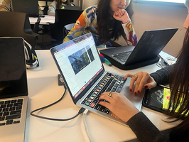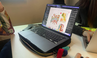 Photo of peers discussing visual elements, concept design and playtesting the project